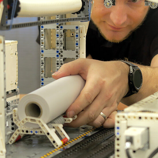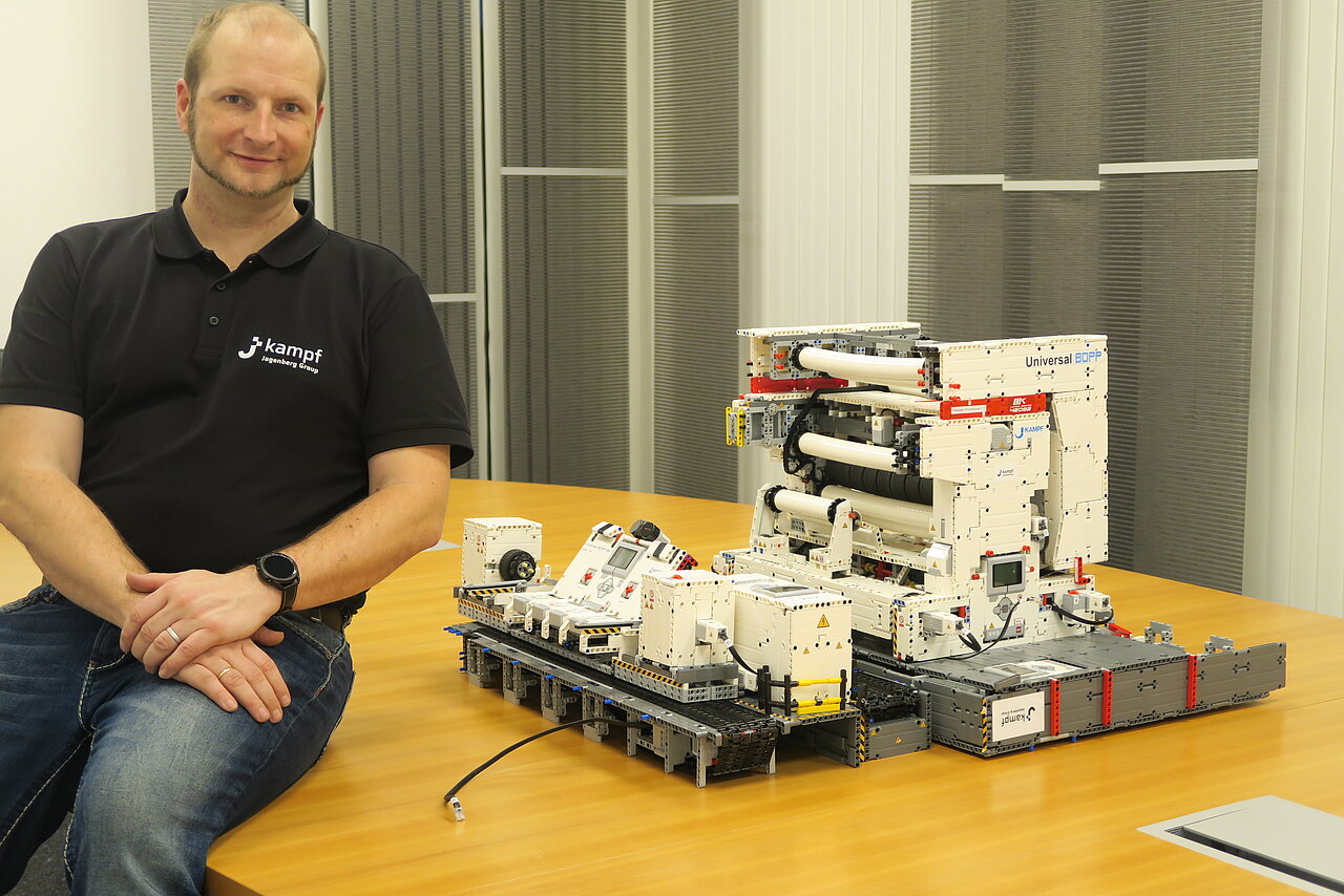 The idea to recreate one of the Universal BOPP cutting machines, like the one he oversees at Fieldservice, first came to Björn Moritz in 2019. "LEGO® Technic" models of cutting machines that student project groups had built, were on display in the training workshop, the so-called "Wissenswerk," of Kampf Schneid- und Wickeltechnik GmbH. "I can do that too – and maybe even much better," the machinist said to himself at the time. "And that's how the passion developed."